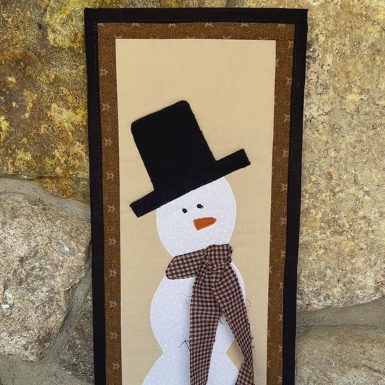 Bring a touch of cozy country charm to your home this winter with our Mini Snowman Banner. This smaller sized banner is perfect for those hard-to-decorate spots and features a charming snowman with a playful scarf made of navy and tan checkered homespun. With a hat made of black wool and stitched eyes, this banner is sure to add a festive and quirky touch to your holiday decor. Measures 17.5" long by 7.5" wide and easy to hang with a wooden dowel and removable jute twine.